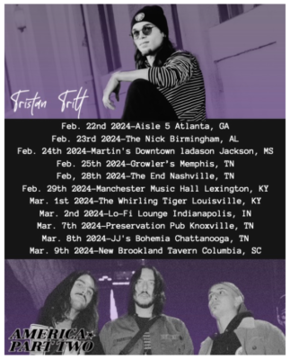He’ll be at The End tonight in Nashville. February the 28th. The 11-date tour kicked off on February 22, 2024 at Aisle 5 in Atlanta, GA and will take Tristan and America Part Two through the Southern US, ultimately finishing on March 9 at New Brookland Tavern in Columbia, SC. Full tour dates below.